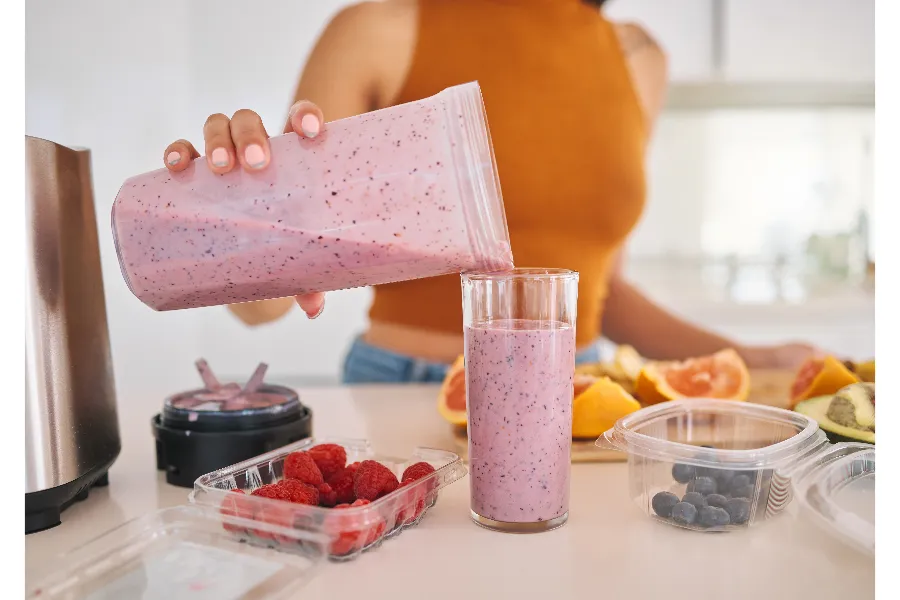 - Proteinowy koktajl z owocami leśnymi – mleko sojowe, białko roślinne, jagody, masło migdałowe, płatki owsiane, siemię lniane.